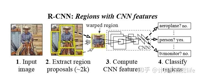 该网络模型如下图所示,其主要流程为:先使用selective search算法提取2000个候选框,然后通过卷积网络对候选框进行串行的特征提取,再根据提取的特征使用SVM对候选框进行分类预测,最后使用回归方法对区域框进行修正。