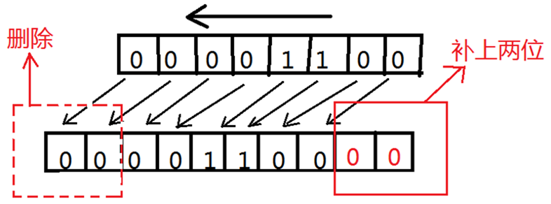 所有的位全都向左移动两位,然后把右边空的两个位用0补上,最左边多出的两个位去掉,最后得到的结果就是00110000 结果就是48