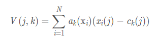 给定N个D维局部图像描述算子xi作为输入,K个聚类中心记为ck,作为VLAD的参数。VLAD的输出是一个K x D维的图像描述向量,为了方便记作V是一个K x D 的矩阵,但是这个矩阵被转换成向量表示,然后再进行归一化,计算公式如下: