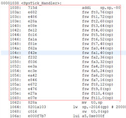 当开启硬件压栈并且编译器中声明使用硬件压栈后,中断函数汇编代码如下图4所示。可见进入中断后直接执行的中断代码,形如图2和图3中的16个寄存器的入栈和出栈由硬件在中断开始和结束时自动完成。同时也可以看出整个中断函数可以减少34条指令。