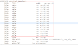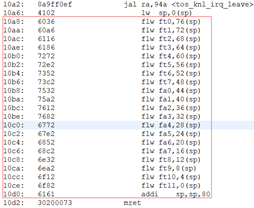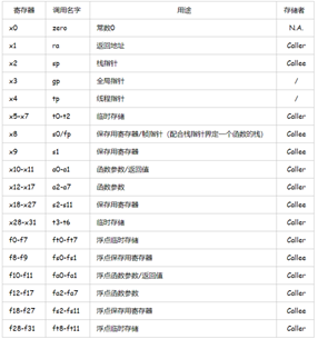 RISC-V寄存器如下图1所示,其中x0-x31为整形寄存器,f0-f31为浮点寄存器(青稞V3没有浮点寄存器)。所有带caller的寄存器,当发生中断时需要保存,值得注意的是,WCH的硬件压栈保存的寄存器仅仅保存整数的16个caller saved 寄存器。正常一个中断函数的寄存器保存我们不用关心,编译器会帮我们做的很好。但是当我们从一个汇编入口进中断函数的时候这些过程就不得不由我们自己来实现。寄存器中几个相对特殊的x0恒为0,x1是返回地址寄存器ra,函数调用时用来存放返回地址,x2为堆栈指针sp,x3为gp全局指针,用来寻址全局变量。