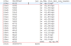 RISC-V内核进中断需要保存caller saved(顾名思义,调用者需要保存)的寄存器。当不开启硬件浮点时,编译器会把16个寄存器在中断函数开始时存入堆栈,中断返回前恢复,如下图2和图3所示。我们内核支持硬件压栈,硬件保存和恢复的也正是这16个寄存器。使用硬件压栈时需要使能硬件功能,即硬件压栈使能(不同芯片配置位置不同,详见手册中断章节),同时也需要通知编译器不自动生成图2和图3中的软件出入栈的代码,即在MRS声明中断函数时由__attribute__((interrupt("WCH-Interrupt-fast")))方式定义编译器不自动添加软件出入栈代码,由__attribute__((interrupt()))方式定义编译器添加软件出入栈的代码。