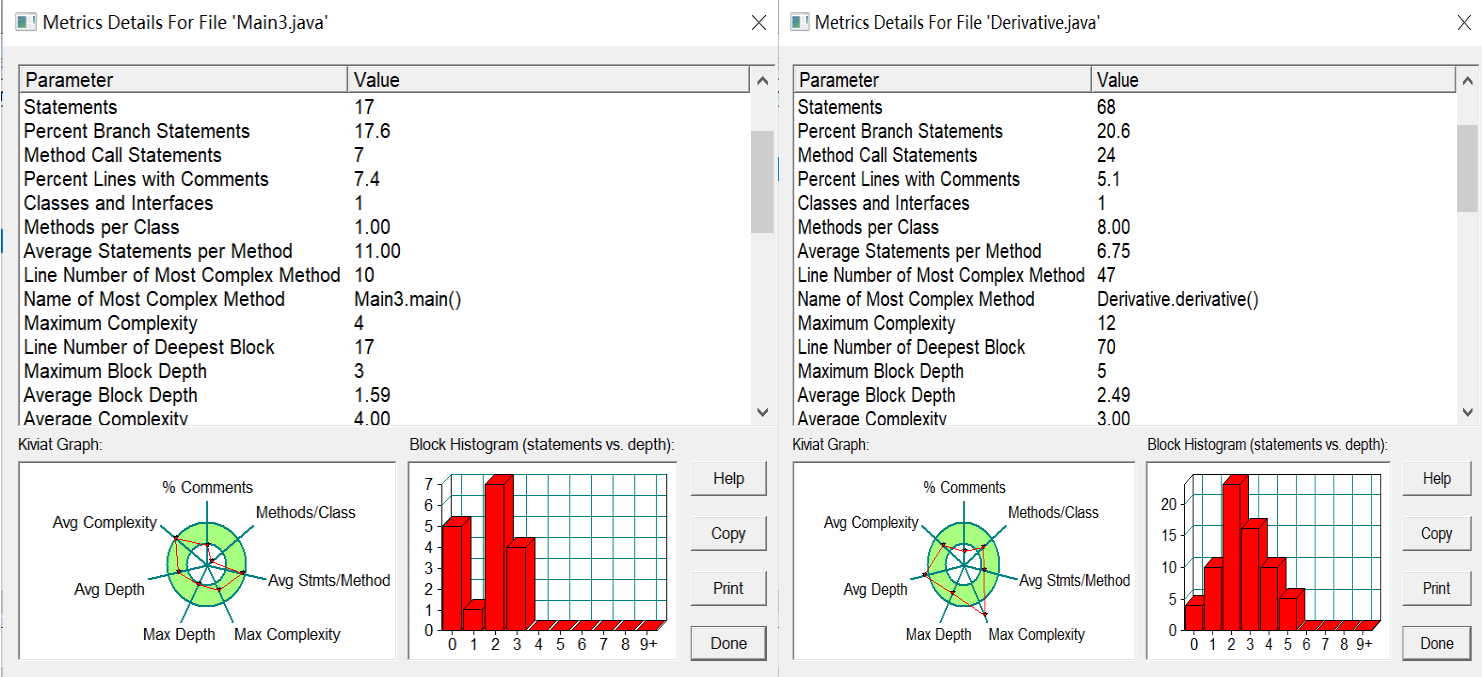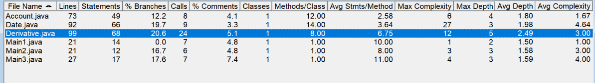 由图可知,我写的题目集三的7-3代码主类复杂度为4,Derivative类复杂度为12。说实话起初不知道如何使用计算机编程去求导,因为需要求导的式子都是字符串类型的多项式,如何把他们拆分倒是费了很大一番功夫。当然,首先是实现非法测试,和仅有常数项的情况。之后先用String.replace(“ ”,“”)除去字符串里的空格用正则表达式写出了(\\-|\\+)?\\d*\\*x\\^(\\-|\\+)?\\d*|(\\-|\\+)?\\d*\\*x这一串特别长的式子进行判断,再用String.find()、String.group()将多项式拆分为单项式。之后把字符串的所有符号给去掉,再判断字符串是不是为空,如果不是空的话,就把字符串里的数字相乘,并且记住字符串里有多少个数字,如果数字为1的话,就直接输出那个数字,最后就是按求导的格式来输出结果。