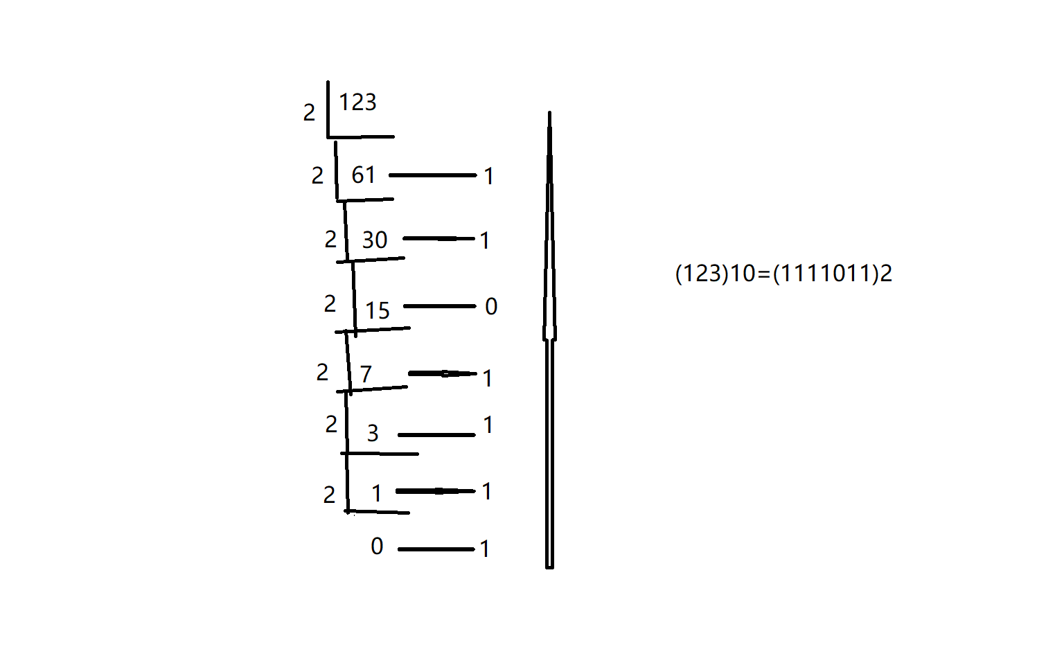 就是十进制转二进制。我常用的方法是短除法。即每次除以二(向下取整),直到为0,最后将余数反向输出。 如图: