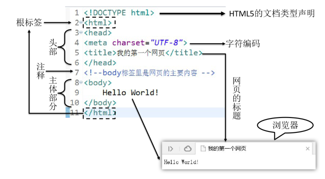 文档声明: HTML文件中第一行的内容,用来告诉浏览器当前HTML文档的基本信息,其中最重要的就是当前HTML文档遵循的语法标准。这里我们只需要知道HTML有4和5这两个大的版本,HTML4版本的文档类型声明是: