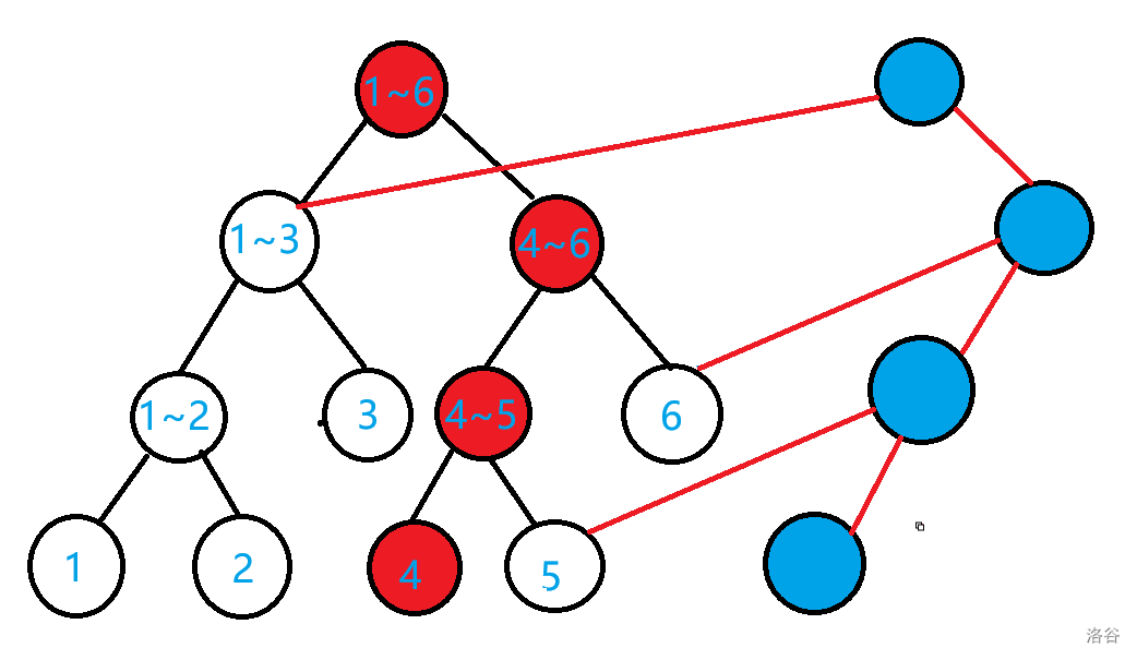 蓝点和白点及其所连的红边和原先的边构成了新的线段树,那我们不难发现,要做到保存每一颗线段树,我们只需要根据修改的点新开一部分的点,若为单点修改,被修改的点的个数为 \(\log(n)\),大多数的点是可以继承的,这样就节省了大量空间。