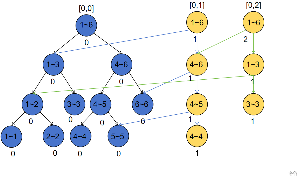 令原数组长度为\(n\) ,对于原数组,统计\([0,i] (0<=i<=n)\)中的数,在离散数组(长度记为\(m\))以线段树区间形式出现的次数,如图展示了\([0,0],[0,1],[0,2]\)三个版本的线段树所对应的值。需要注意的是,重复的数也要累入统计,如\([0,4]\)版本的线段树对应区间\((2,2)\)的值为\(2\),即有两个\(2\)