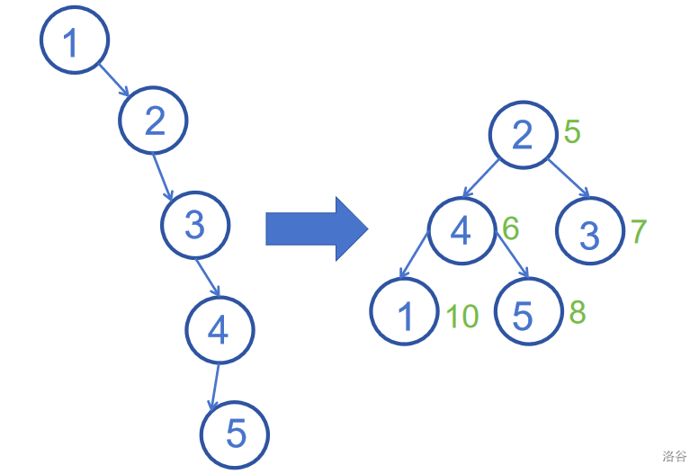 如图所示,若我们将键值为\(1,2,3,4,5\) 的序列依次加入BST,则是左边的链,右边则是一种可能的随机堆优化