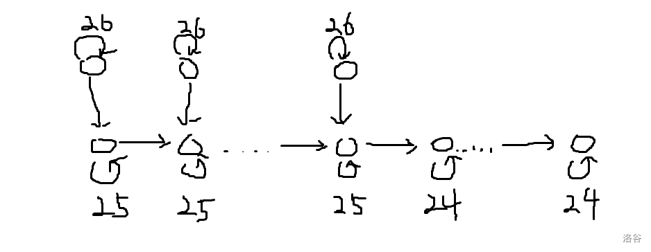 - 此外,若 \(i>j\) 即匹配完毕:\(f_{i,j,k}\times 26\to f_{i,j,k+1}\)。