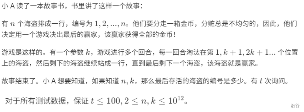 记 \(F(n,k)\) 为答案,令 \(z=F(n-{\lceil \frac{n}{k} \rceil})\),那么 \(F(n,k)=z+{\lceil \frac{z}{k-1} \rceil}\)。