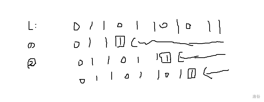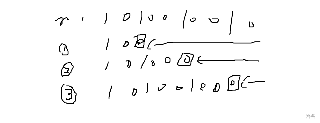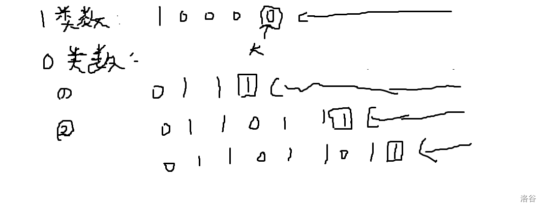 综上,\(1\) 类数可以凑出的数形如:最高位为 \(1\) 然后跟着若干个连续 \(0\),之后 \([0,k)\) 位随便取。总数为 \(2^k\)。