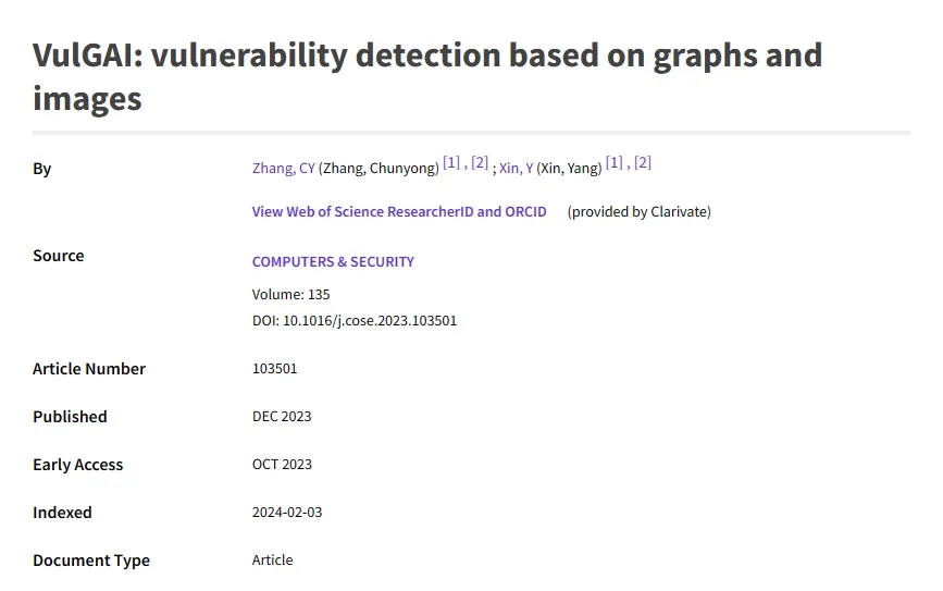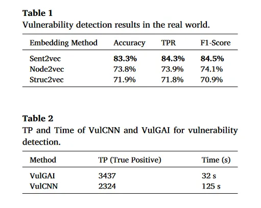 实验结果表明,与其他先进的漏洞检测技术相比,VulGAI的准确率、TPR和F1-Score均更高。此外,我们还对 VulGAI 和 VulCNN 在 30,270 个真实世界的函数上进行了全面比较。VulGAI 在 TP 上的表现比 VulCNN 好 1.48 倍,VulGAI 的计算参数比 VulCNN 少 8.77 倍。VulGAI 的检测速度比 VulCNN 快约 3.9 倍。VulGAI可以实现代码漏洞扫描的可扩展性和准确性。