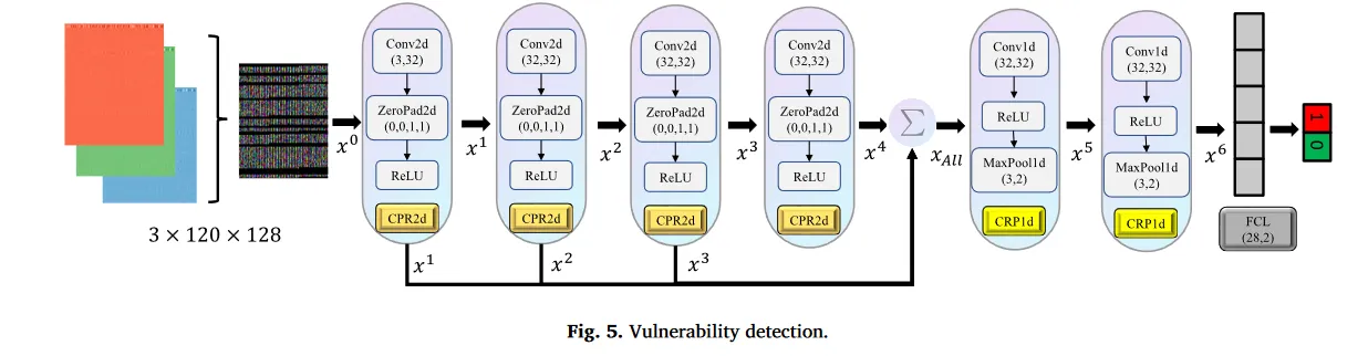我们的漏洞检测模型包括跳跃结构的二维卷积神经网络、一维卷积神经网络和全连接层。具有跳转结构的CNN模型可以保留每一层的程序细节。这是一种新型的漏洞检测网络。为了解释代码行是否易受攻击,我们使用梯度加权类激活映射++(以下简称Grad-CAM++)(Chattopadhay et al., 2018)来获得相应的热图。这可以解释哪一行代码更有可能是易受攻击的代码。我们的方法可以快速帮助程序员检查漏洞。