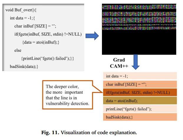RQ3,我们设计了实验 5 和一个案例研究。实验5:验证VulGAI在真实世界中的漏洞检测性能。我们从FFmpeg和QEMU项目中选择了一个真实的函数示例,我们称之为ffmqem(周等人,2019)。ffmqem 数据集包含 9776 个易受攻击的函数和 20494 个中性函数。我们在SARD_NVD上训练 VulGAI 和 VulCNN 模型。最后,我们得到了检测ffmqem的最佳模型。我们记录了 VulGAI 和 VulCNN 检测到的漏洞数量和检测时间。个案研究。我们展示了一些正确检测到的漏洞的示例。最后,我们解释了一个使用梯度加权类激活映射++的代码示例(图像)(Chattopadhay 等人,2018 年)。