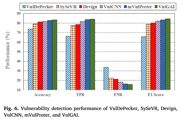 RQ1,我们设计实验 1。实验1:为了验证VulGAI的漏洞检测性能,我们比较了基于深度学习的高级漏洞检测方法,即切片级漏洞检测方法VulDePecker(Li et al., 2018),SySeVR(Li et al., 2021b)和函数级漏洞检测方法Devign(周 et al., 2019)和VulCNN(Wu et al., 2022)。最后,我们记录了这些方法的漏洞检测结果(准确率、TPR和F1-Score值)。