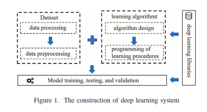深度学习系统的构建涉及几个组成部分,包括数据集、学习程序和深度学习库。