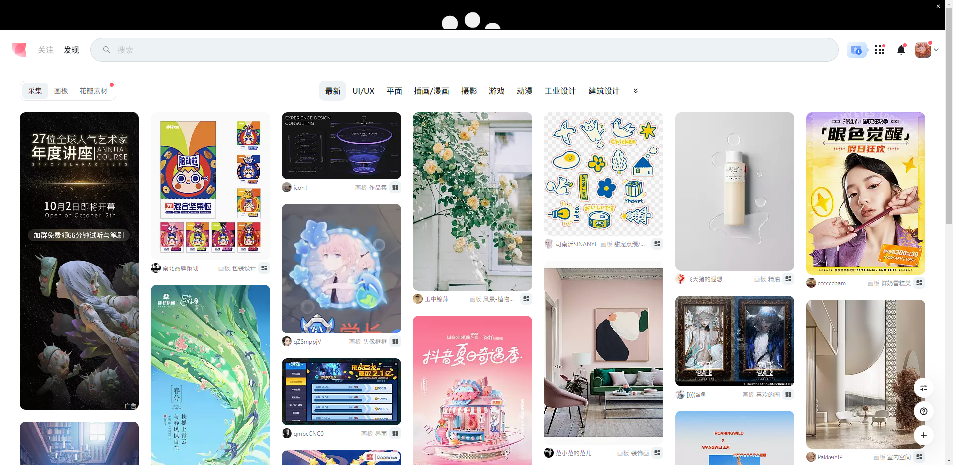 https://huaban.com/follow 花瓣网 设计师最基础的网站,上面有无数素材与各个类型的设计供参考。