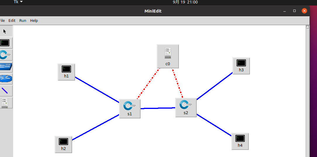- 搭建下图所示拓扑,完成相关 IP 配置,并实现主机与主机之间的 IP 通信。用抓包软件获取控制器与交换机之间的通信数据包。