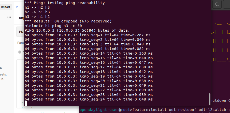 4.通过Postman工具调用OpenDaylight提供的API下发流表,实现拓扑内主机h1和h3网络中断10s。
