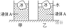 甲容器中,冰熔化,液体\(A\)的液面会下降,水漂在\(A\)上。但是,液体\(A\)液面再降也不会超过冰的最低点。(很明显嘛,冰排开的那一块左右不是还有液体,可以填充一些深度。)