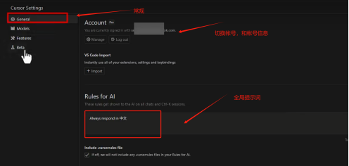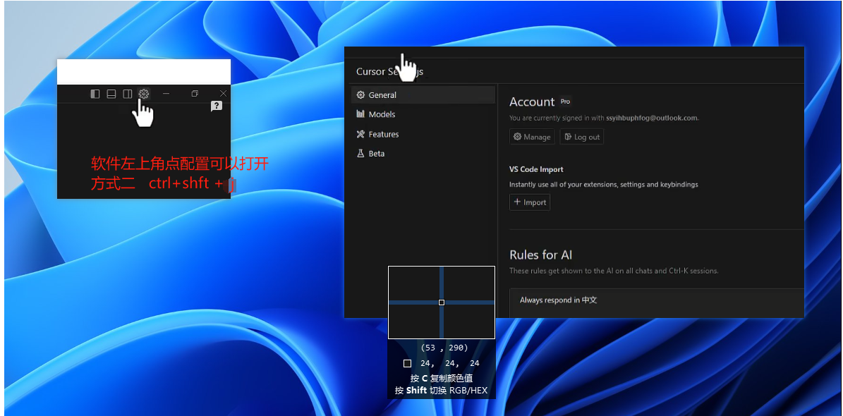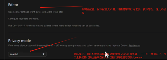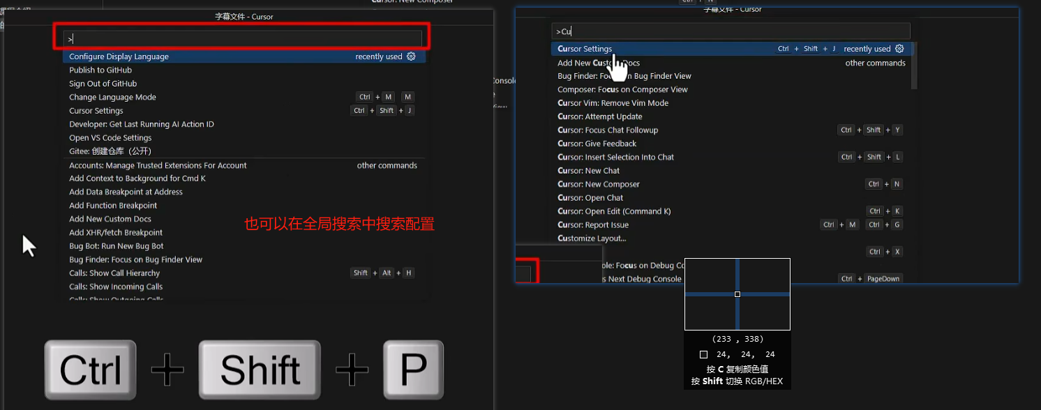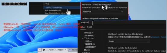 方式三 ctrl+ shft + p 可以找开全局搜索,然后找到 cusor settings