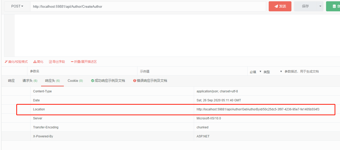 添加成功后调用GetAuthorByid方法,返回码为201,在Heard头中Location中的地址为跳转的url