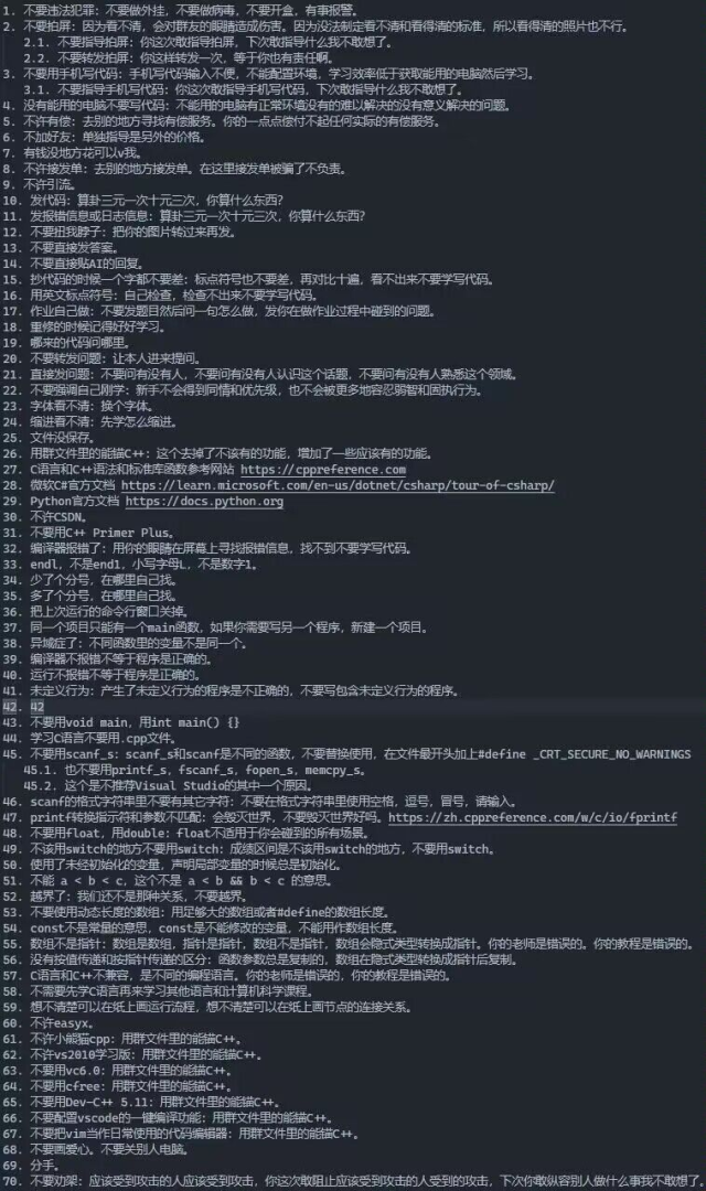 关于调代码,请务必首先检查你的代码是否能运行,不要拿着一份 compile error 的代码找别人问,除非你真的不知道你的代码为什么连运行都运行不了。另外请先尝试自行调试,调试能力的重要性不亚于写代码能力,毕竟没有人能保证一次写对。另外希望询问代码结构提问的时候你能说出某一段是用做什么,而不是chatgpt写的。欢迎任何调试的提问。