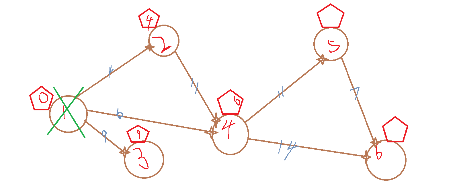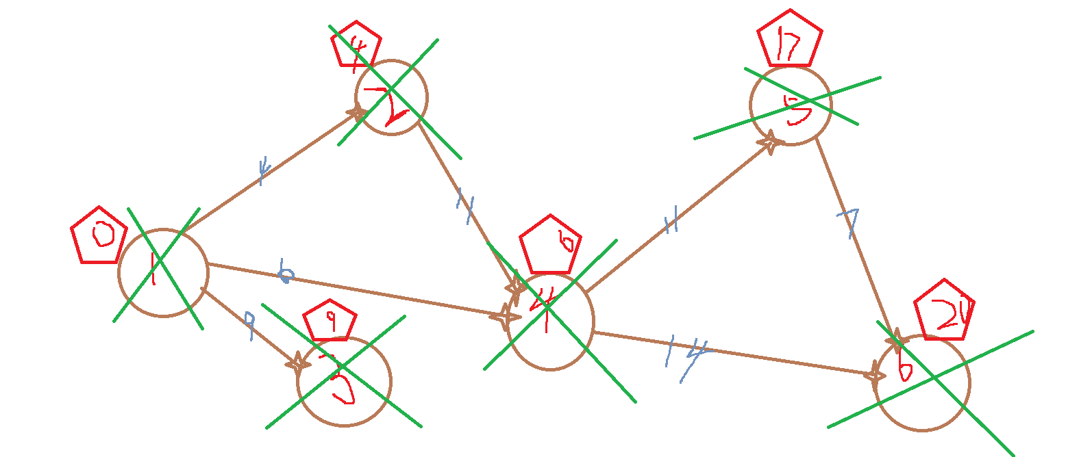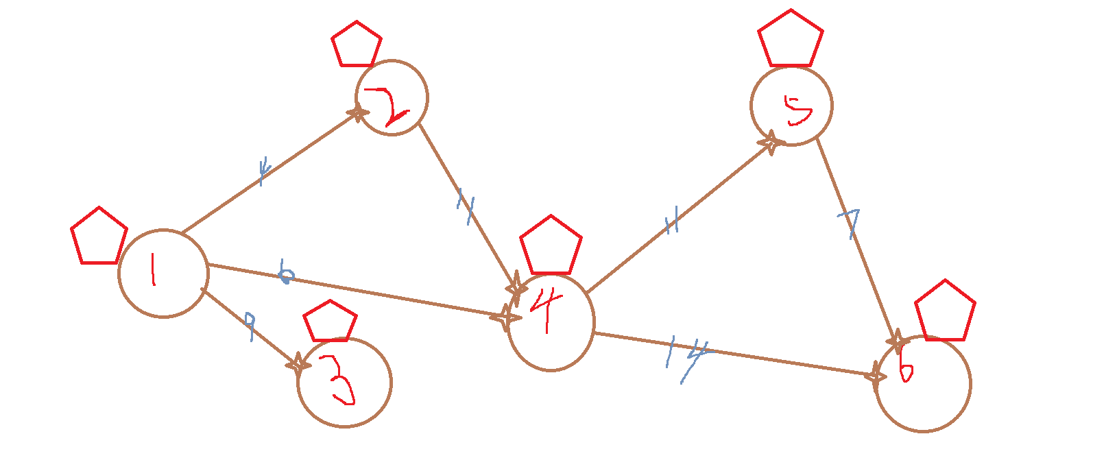 在这张图中,1号点为起点,每根棕色的边都是由小序号通向大序号的一条有向边,上面的数字代表该边的权值