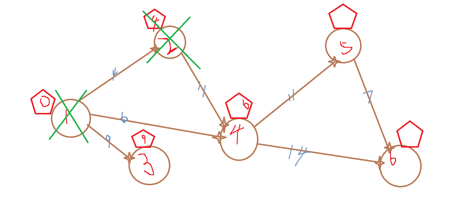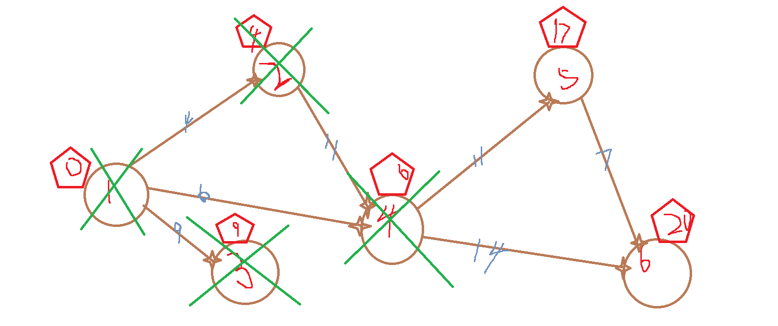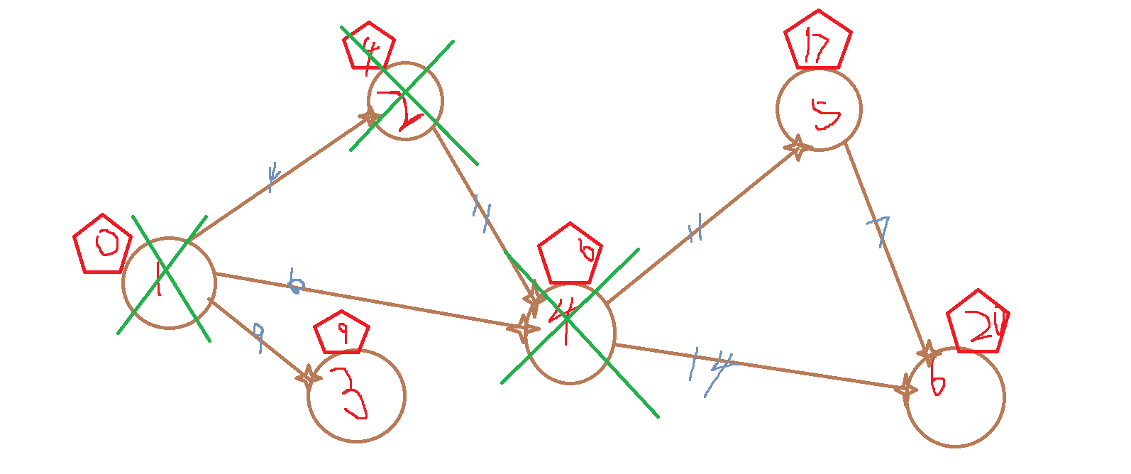 在这张图中,1号点为起点,每根棕色的边都是由小序号通向大序号的一条有向边,上面的数字代表该边的权值