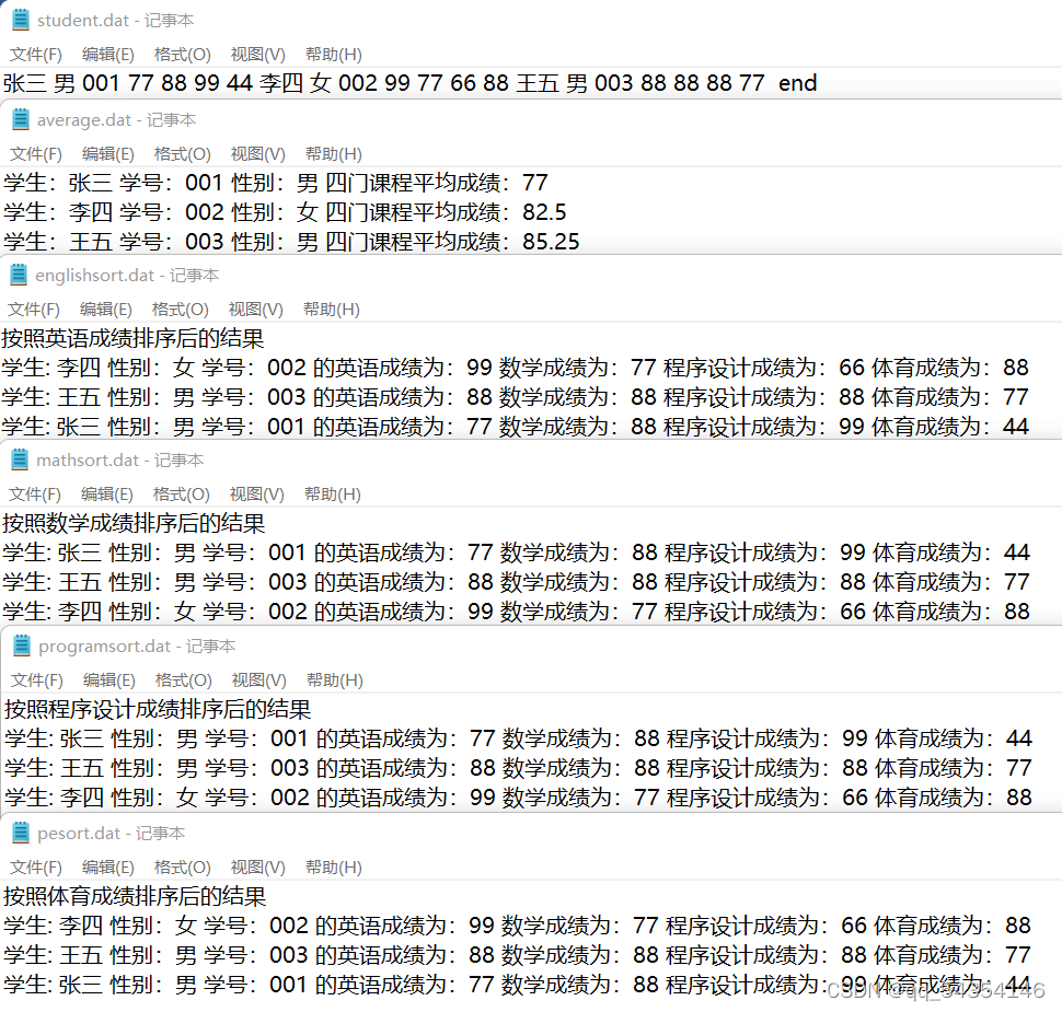 分别按照英语、数学、程序设计和体育成绩排序生成结果文件。
