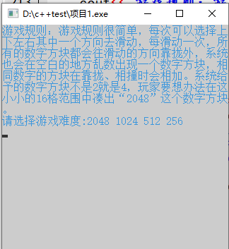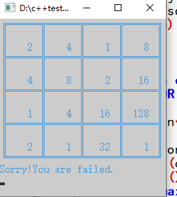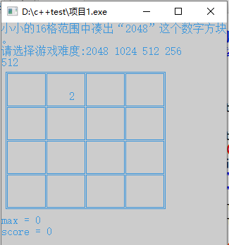 int main(){ system("mode con cols=40 lines=20"); system("COLOR 73"); int n,m=1; cout<<"游戏规则:游戏规则很简单,每次可以选择上下左右其中一个方向去滑动,每滑动一次,所有的数字方块都会往滑动的方向靠拢外,系统也会在空白的地方乱数出现一个数字方块,相同数字的方块在靠拢、相撞时会相加。系统给予的数字方块不是2就是4,玩家要想办法在这小小的16格范围中凑出“2048”这个数字方块。"<<endl; cout<<"请选择游戏难度:2048 1024 512 256"<<endl; int x; cin>>x; intt(); while (button<=16) { if (button==16) if(!(check_fail())) break; outt_mid();//输出 cout<<"max = "<<maxn<<endl; cout<<"score = "<<score<<endl; if(maxn>=x) cout<<"Congratulations! You are win!"<<endl; char ch=check();//读入方向键 switch(ch){ case 'l':run('l');break; case 'r':run('r');break; case 'd':run('d');break; case 'u':run('u');break; } if(button<16) add_num(); system("cls");//清除 } if (button==16) { outt_mid(); cout<<"Sorry!You are failed."<<endl; } while(1); return 0; }
