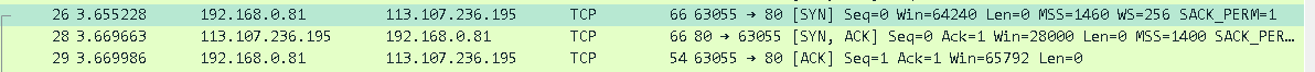 本地主机将标志位SYN(同步序列编号)命名为1,随机产生一个值seq=x(此处为0),将其发送给服务器,本地主机进入 请求连接,等待服务器回复 的状态,等待服务器确认。
