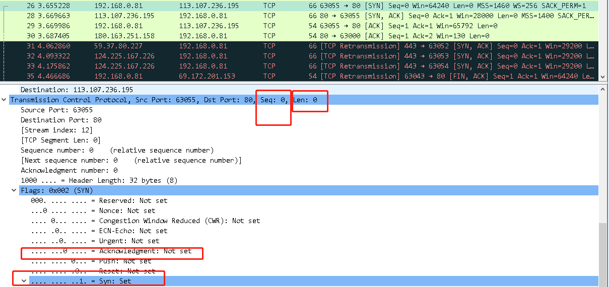 标志位只有同步位,此过程是请求(SYN)
