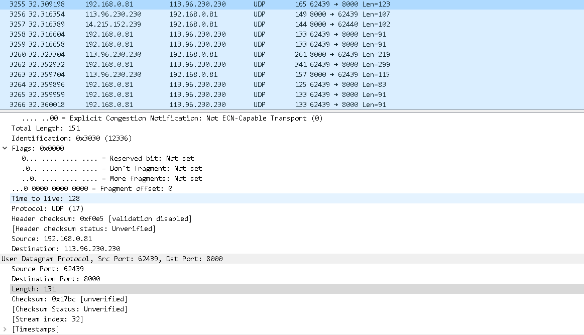 原端口62439字节,目的端口8000字节,长度131字节