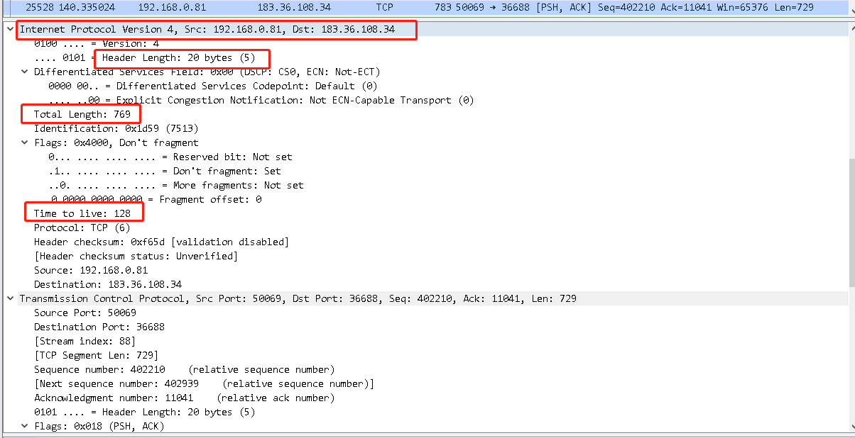 IPV4版本,源地址192.168.0.81,目的地址183.36.108.34,IP报文段总长度769,存活时间为128