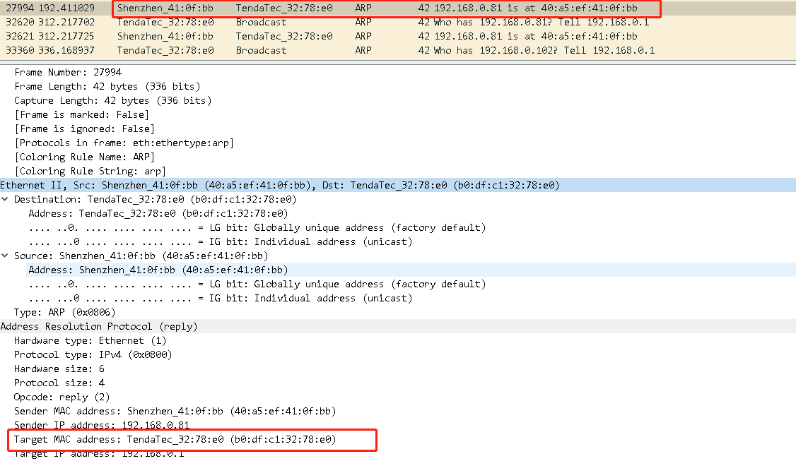192.168.0.81 is at40:a5:ef:41:0f:bb 意思是“192.168.0.81的MAC地址是40:a5:ef:41:0f:bb”