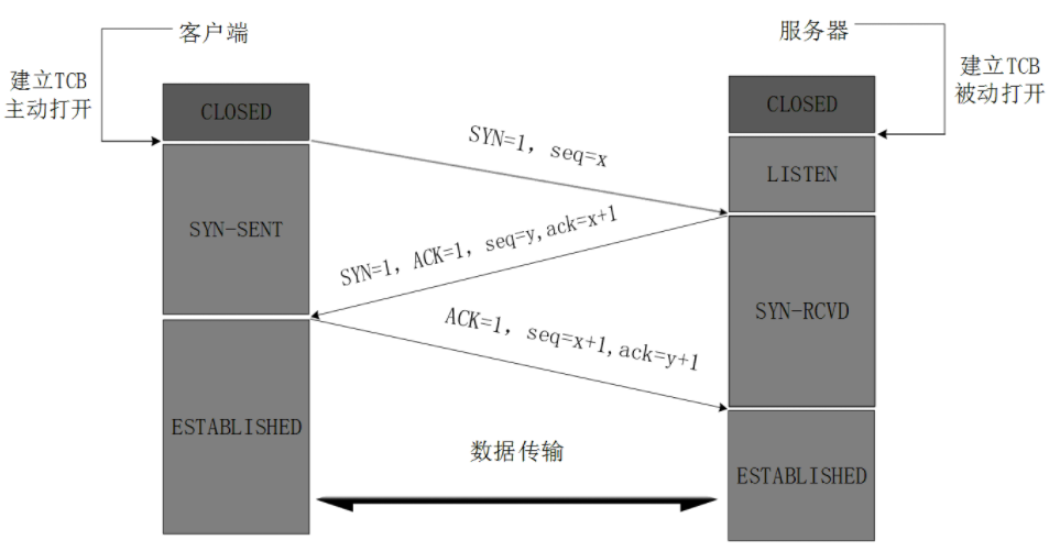 首部的同步位SYN=1,初始序号seq=x,(SYN=1的报文段不能携带数据)但要消耗掉一个序号,此时TCP客户进程进入SYN-SENT(同步已发送)状态