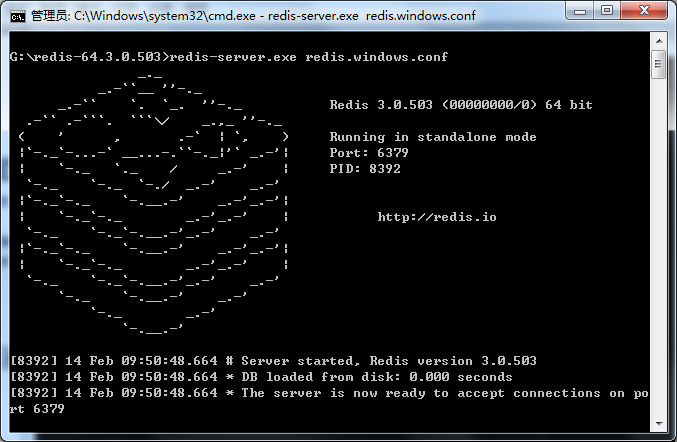 如果是通过双击redis-server.exe启动的,配置文件不会被指定,所以之前的修改无效。我们需要在redis目录位置打开命令行,输入redis-server.exe redis.conf(或者redis-server.exe redis.windows.conf),回车。