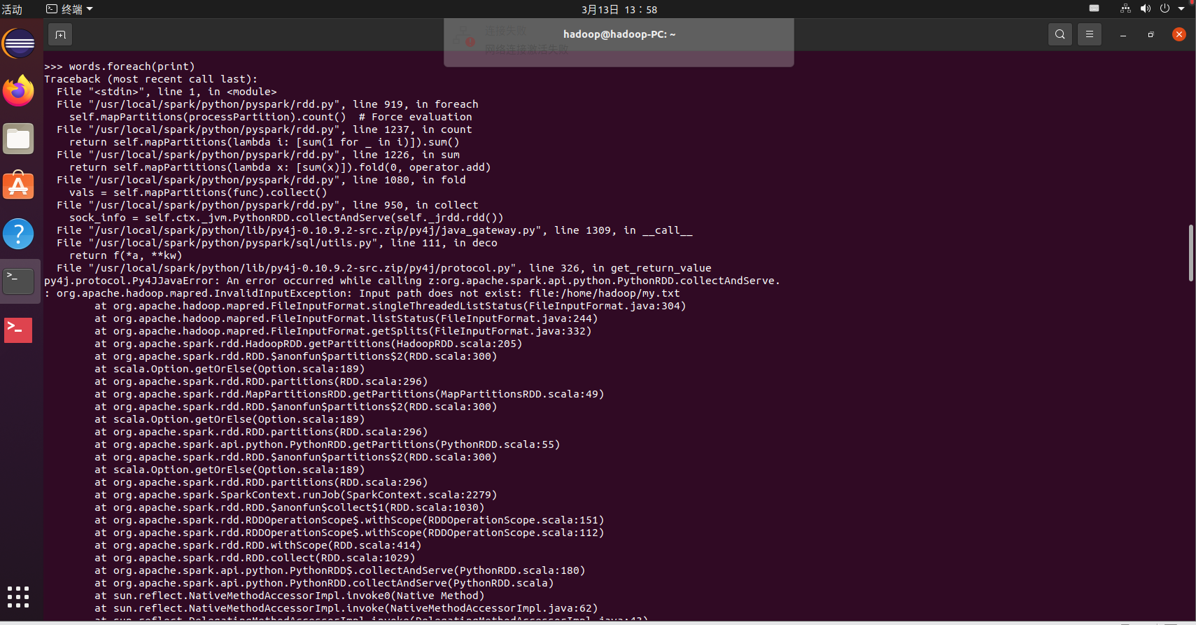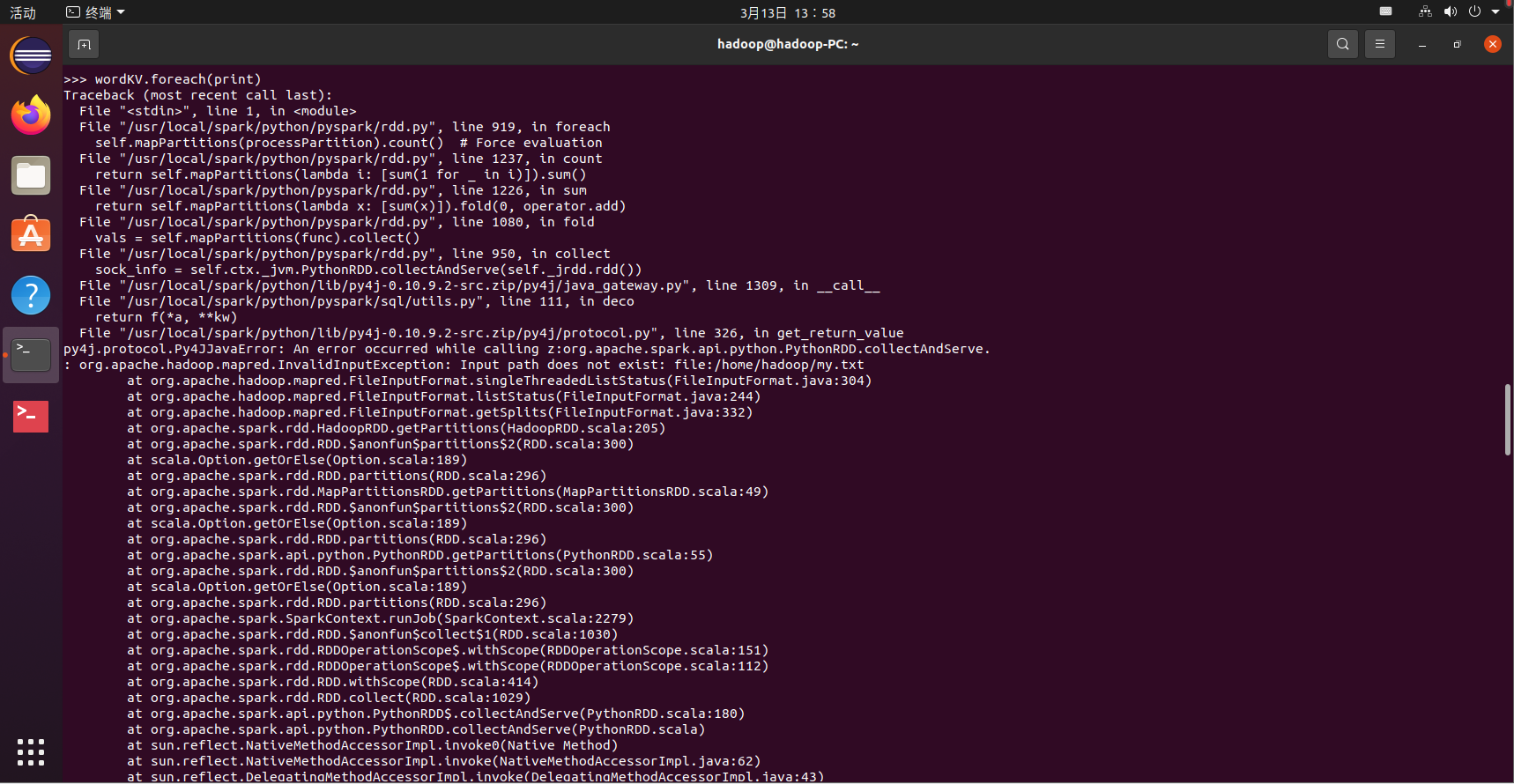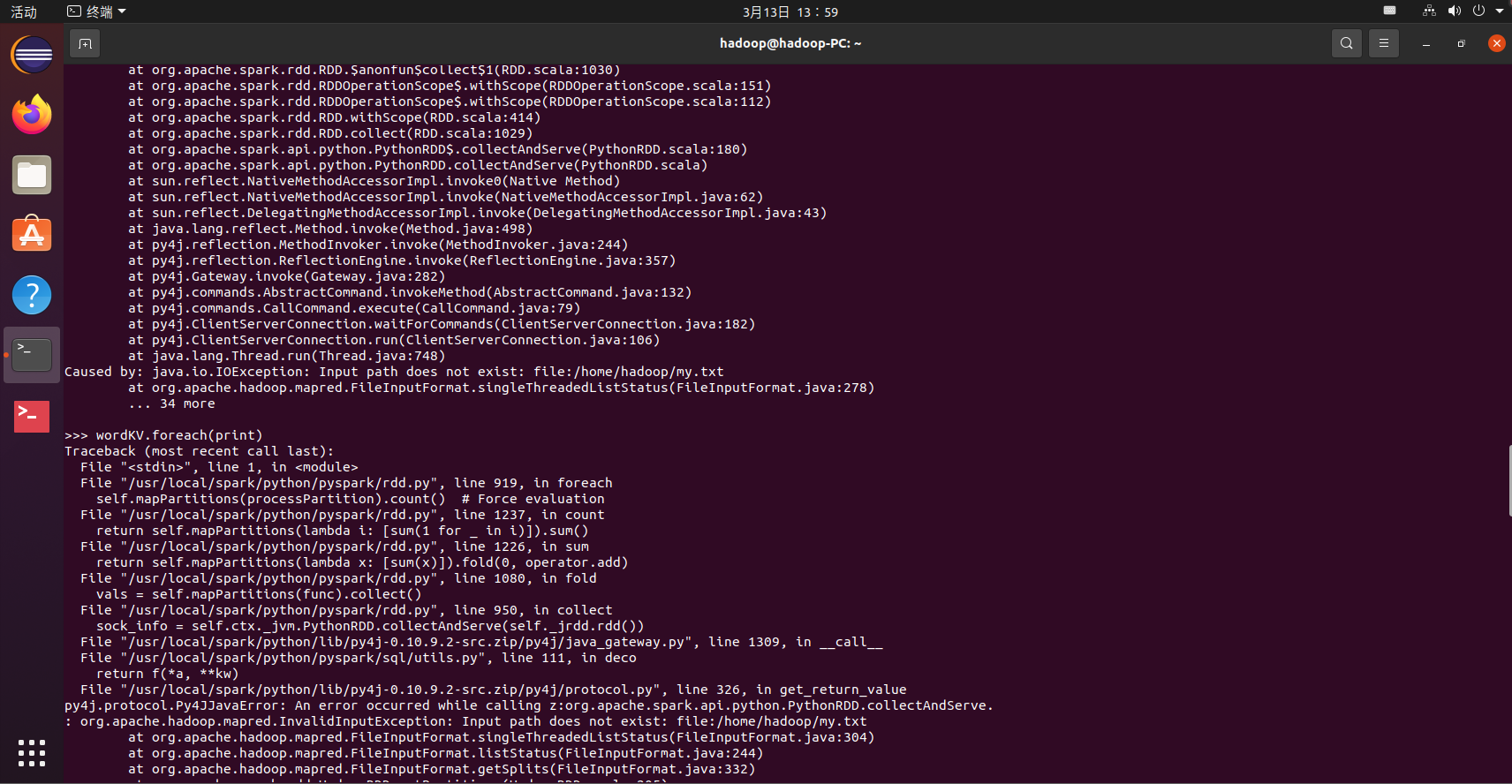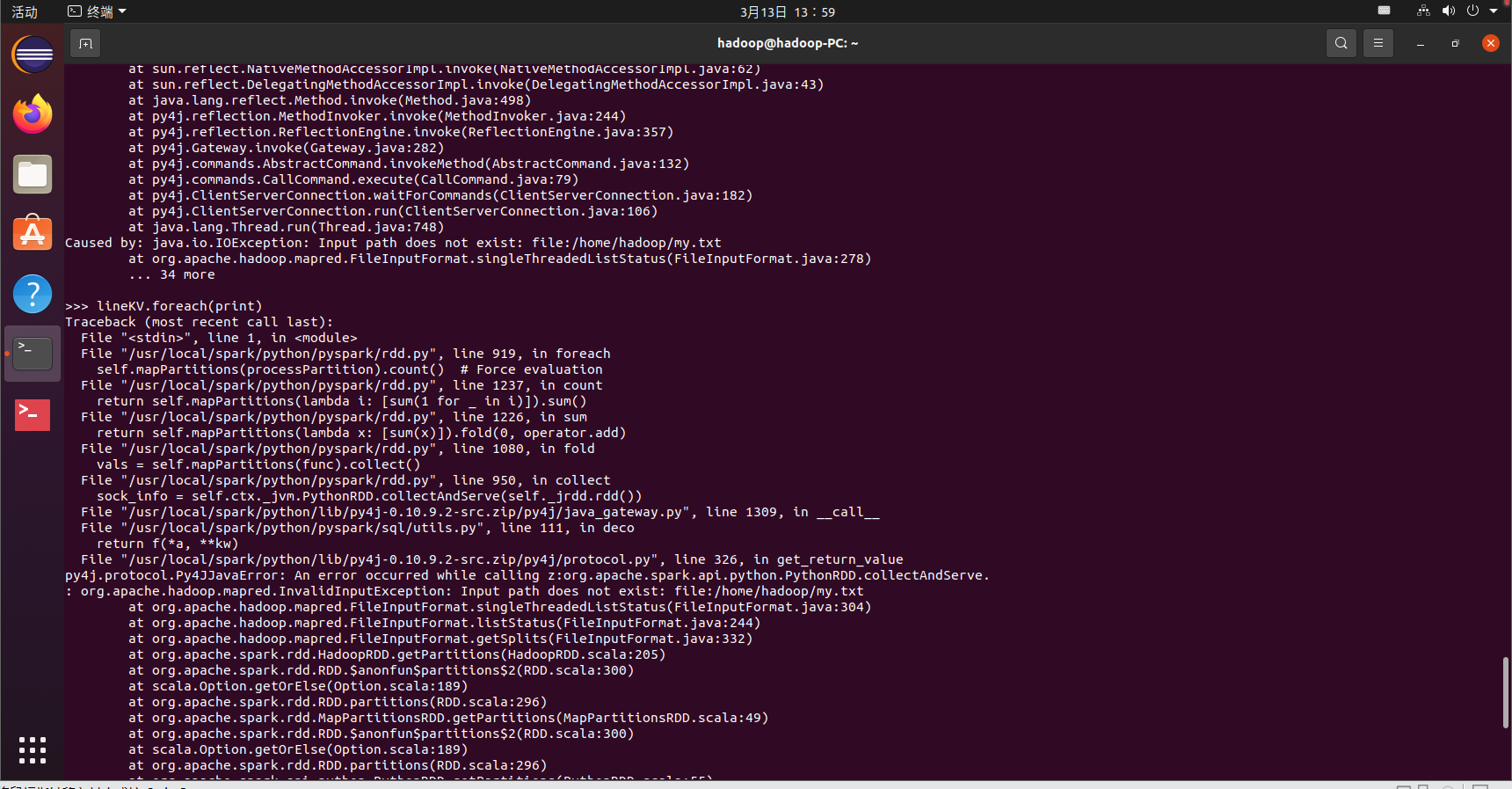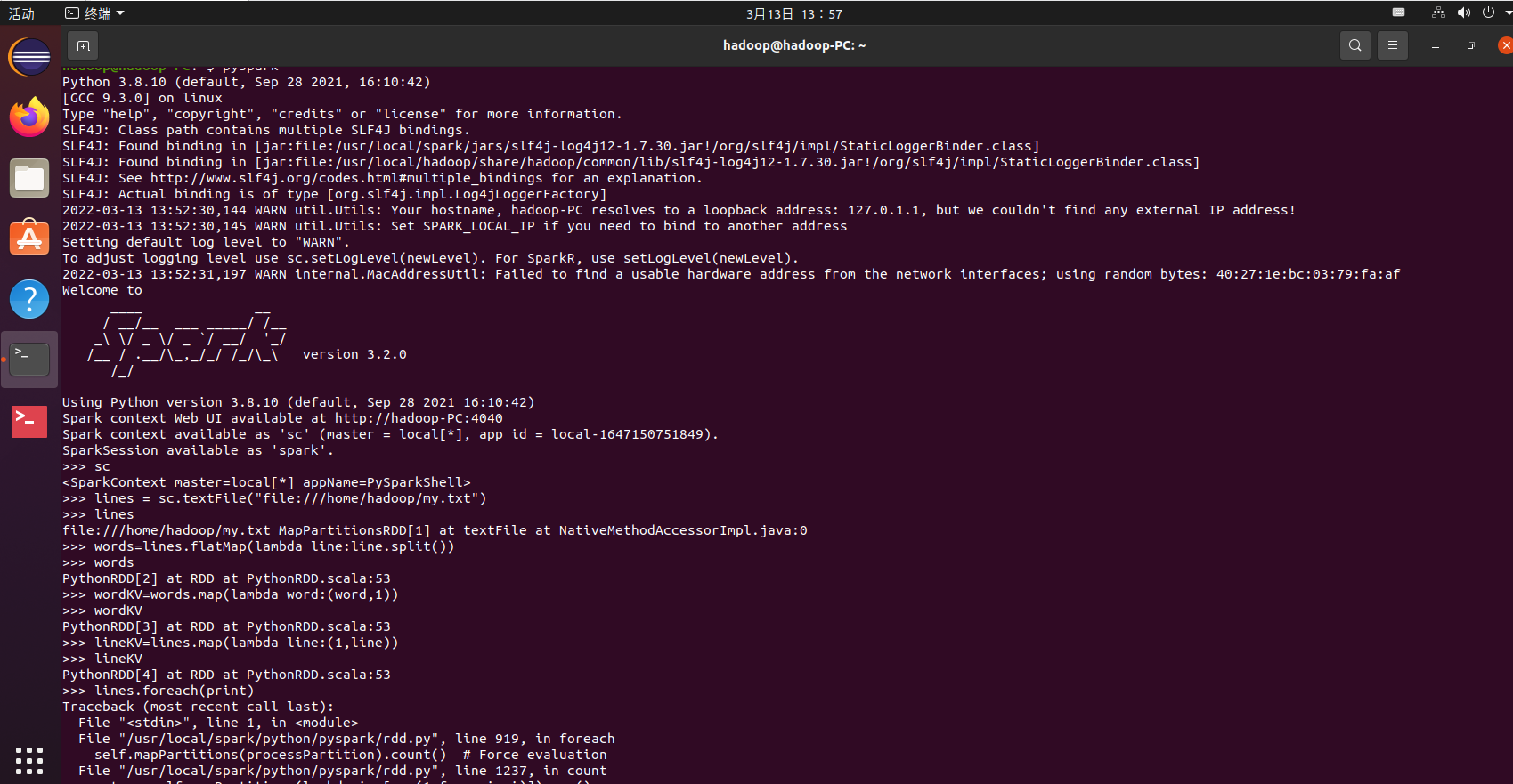 >>> lines = sc.textFile("file:///home/hadoop/my.txt")