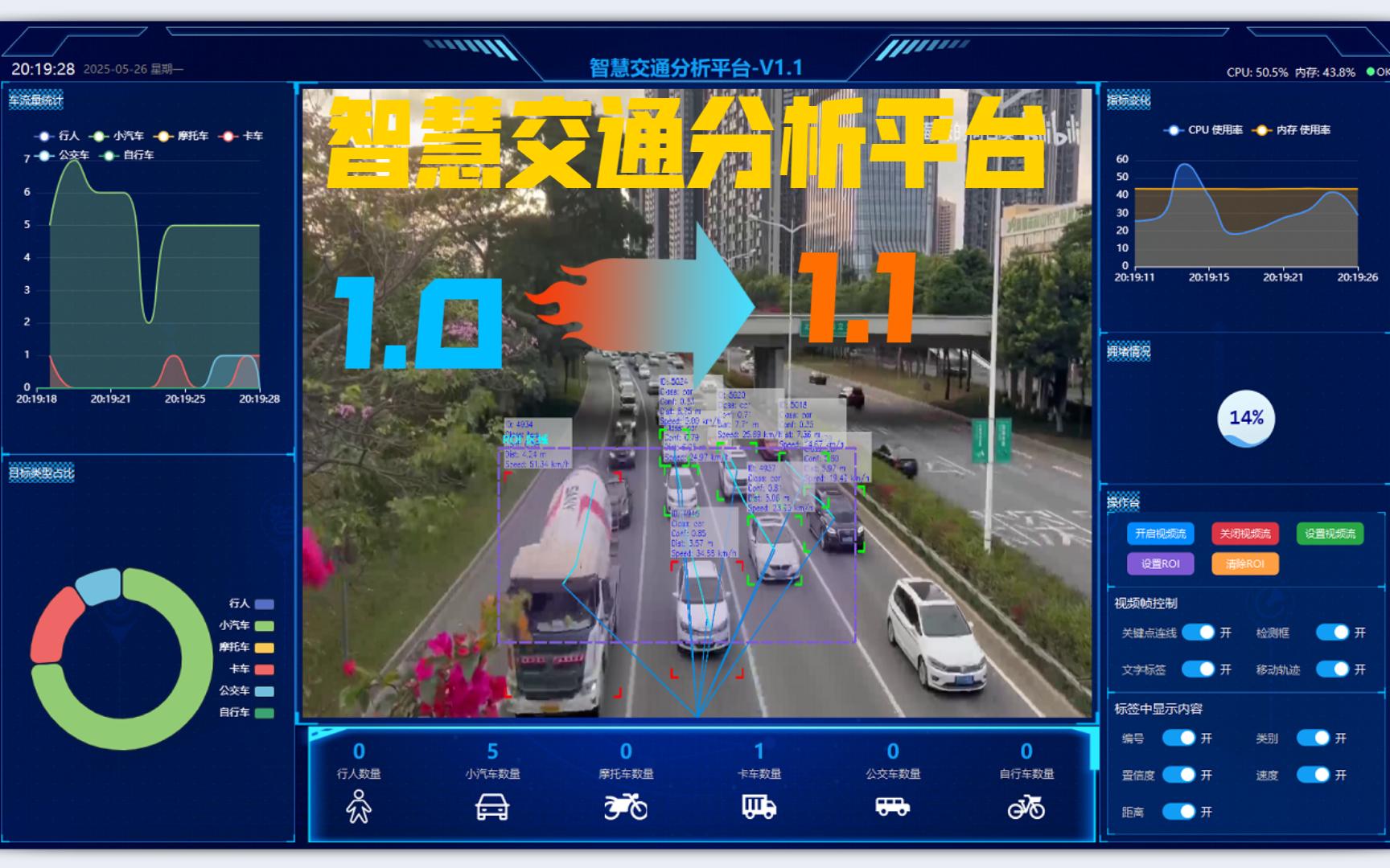 本次使用PyQt5+YOLOv8开发一款“智慧交通分析平台”,使用YOLOv8检测监控画面中的车辆和行人,将检测到的画面进行绘制、标注、统计,最后展示到画面中央,主屏右侧操作区域可以控制绘制结果。