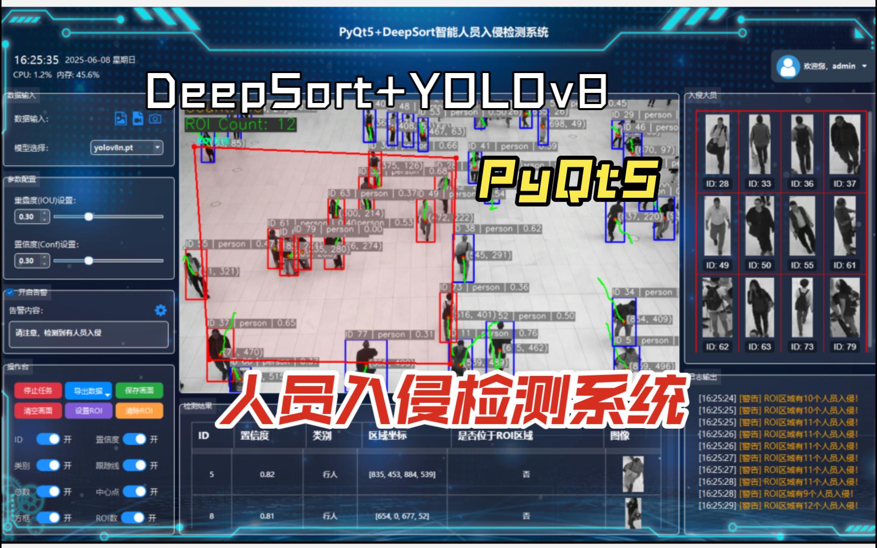 本次使用PyQt5+DeepSort实现了一个智能人员入侵检测系统,系统包括多个区域支持ROI感兴趣区域标注告警,支持展示区域内标签显隐控制,自动统计全部目标以及ROI区域内目标,支持数据导出、入侵人员照片查看,动态阈值调整。