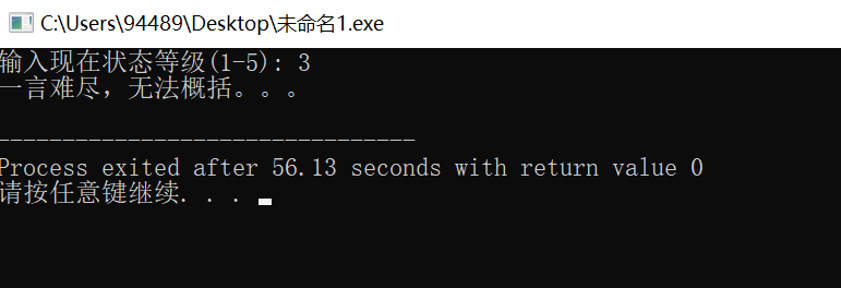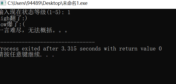 /* switch语句使用示例 输入1,2,3...的不同整数,显示不同提示信息 */ #include <stdio.h> int main() { int level; printf("输入现在状态等级(1-5): "); scanf("%d",&level); switch(level) { case 1: printf("high翻了:)\n"); break; case 2: printf("low爆了:(\n"); break; default: printf("一言难尽,无法概括。。。\n"); } return 0; }