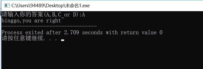 #include <stdio.h> int main() { char x; printf("请输入你的答案(A,B,C or D):"); scanf("%c",&x); if(x=='A') printf("binggo,you are right~"); else printf("try again~"); return 0;