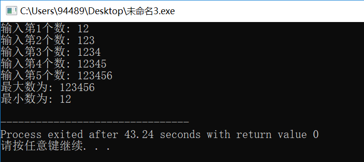 #include <stdio.h> int main() { int number, max, min, n; n=1; printf("输入第%d个数: ", n); scanf("%d", &number); max = number; min = number; while(n<5){ n++; printf("输入第%d个数: ", n); scanf("%d", &number); if(number>max) max = number; else if(number<min) min =number;} } printf("最大数为: %d\n", max); printf("最小数为: %d\n", min); return 0; }