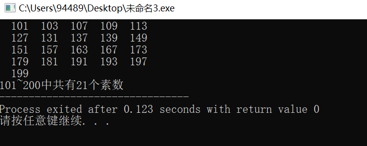 printf("\n101~200中共有%d个素数",p);