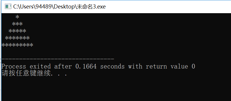 #include <stdio.h> int main() {int line,col; for(line=1;line<=5;line++) {for(col=5-line;col>0;col--) {printf(" ");} for(col=1;col<=2*line-1;col++) {printf("*");} printf("\n");} return 0; }