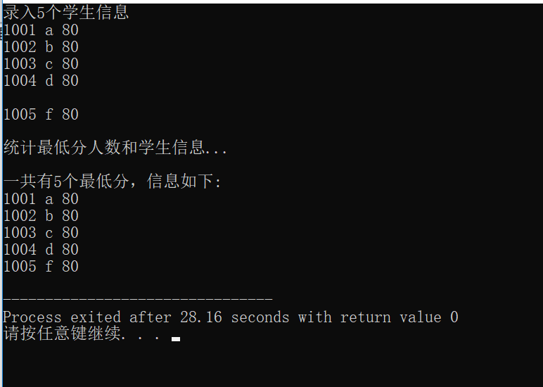 #include <stdio.h> const int N=5; typedef struct student { long no; char name[20]; int score; }STU; void input(STU s[], int n); int findMinlist(STU s[], STU t[], int n); void output(STU s[], int n); int main() { STU stu[N], minlist[N]; int count; printf("录入%d个学生信息\n", N); input(stu, N); printf("\n统计最低分人数和学生信息...\n"); count = findMinlist(stu, minlist, N); printf("\n一共有%d个最低分,信息如下:\n", count); output(minlist, count); return 0; } void input(STU s[], int n) { int i; for(i=0; i<n; i++) scanf("%ld %s %d", &s[i].no, s[i].name, &s[i].score); } void output(STU s[], int n) { int i; for(i=0; i<n; i++) printf("%ld %s %d\n", s[i].no, s[i].name, s[i].score); } int findMinlist(STU s[], STU t[], int n) { int i,j,min=s[0].score; for(i=0;i<n;i++) { if(s[i].score<min) min=s[i].score; } i=0; for(j=0;j<n;j++) { if(s[j].score==min) t[i++]=s[j]; } return i; }
