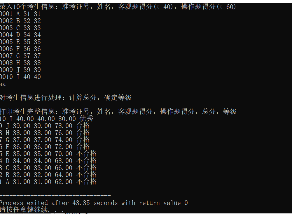 #include <stdio.h> #include <string.h> const int N = 10; typedef struct student { long int id; char name[20]; float objective; float subjective; float sum; char level[10]; }STU; void input(STU s[], int n); void output(STU s[], int n); void process(STU s[], int n); int main() { STU stu[N]; printf("录入%d个考生信息: 准考证号,姓名,客观题得分(<=40),操作题得分(<=60)\n", N); input(stu, N); printf("\n对考生信息进行处理: 计算总分,确定等级\n"); process(stu, N); printf("\n打印考生完整信息: 准考证号,姓名,客观题得分,操作题得分,总分,等级\n"); output(stu, N); return 0; } void input(STU s[], int n) { int i; for(i=0;i<n;i++) scanf("%ld %s %f %f ",&s[i].id,s[i].name,&s[i].objective,&s[i].subjective); } void output(STU s[], int n) { int i; for(i=0;i<n;i++) printf("%ld %s %.2f %.2f %.2f %s\n",s[i].id,s[i].name,s[i].objective,s[i].subjective,s[i].sum,s[i].level); } void process(STU s[], int n) { int i,j,k; STU temp; for(i=0;i<n;i++) s[i].sum=s[i].subjective+s[i].objective; for(j=0;j<n-1;j++) { for(k=0;k<n-j-1;k++) { if(s[k].sum<s[k+1].sum) { temp=s[k];s[k]=s[k+1];s[k+1]=temp; } } } i=0; for(i=0;i<n;i++) { if(i==0) strcpy(s[i].level,"优秀"); else if(i>=1&&i<=4) strcpy(s[i].level,"合格"); else if(i>=5&&i<=9) strcpy(s[i].level,"不合格"); } }