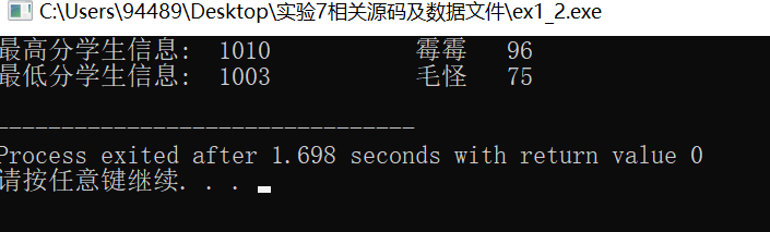 // 从文本文件file1.dat中读取数据,找出最高分和最低分学生信息,并输出在屏幕上 #include <stdio.h> #include <stdlib.h> #define N 10 // 定义一个结构体类型STU typedef struct student { int num; char name[20]; int score; }STU; int main() { STU st, stmax, stmin; int i; FILE *fp; // 以只读文本方式打开文件file1.dat fp = fopen("file1.dat", "r"); if( !fp ) { // 如果打开失败,则输出错误提示信息,然后退出程序 printf("fail to open file1.dat\n"); exit(0); } stmax.score = 0; // 先假定最高分是0,后面如发现比当前最高分还高的分数,就更新最高分 stmin.score = 100; // 先假定最低分是100分,后面如发现比当前最低分更低的分数,就更新最低分 while( !feof(fp) ) { fscanf(fp, "%d %s %d", &st.num, st.name, &st.score); // 从fp指定的文件中格式化读取一个学生信息 if(st.score > stmax.score) stmax = st; else if(st.score < stmin.score) stmin = st; } fclose(fp); printf("最高分学生信息: %5d%15s%5d\n", stmax.num, stmax.name, stmax.score); printf("最低分学生信息: %5d%15s%5d\n", stmin.num, stmin.name, stmin.score); return 0; }