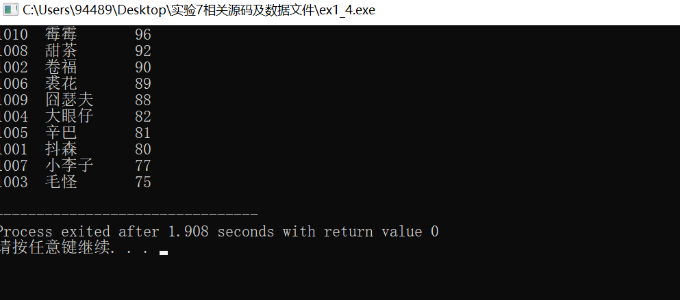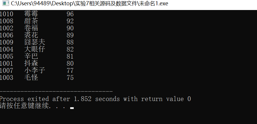 // 从文本数据文件file1.dat中读入数据,按成绩从高到低排序,并将排序结果输出到屏幕上,同时,也以二进制方式存入文件file4.dat中。 #include <stdio.h> #include <stdlib.h> #define N 10 // 定义一个结构体类型STU typedef struct student { int num; char name[20]; int score; }STU; void sort(STU *pst, int n); // 函数声明 int main() { FILE *fin, *fout; STU st[N]; int i; // 以只读文本方式打开文件file1.dat fin = fopen("file1.dat", "r"); if( !fin ) { // 如果打开失败,则输出错误提示信息,然后退出程序 printf("fail to open file1.dat\n"); exit(0); } // 从fin指向的数据文件file1.dat中读取数据到结构体数组st for(i=0; i<N; i++) fscanf(fin, "%d %s %d", &st[i].num, st[i].name, &st[i].score); fclose(fin); // 关闭fin指向的文件file1.dat // 调用函数sort()对数组st中数据,按分数由高到低排序 sort(st, N); // 以写方式打开/创建二进制文件file4.dat fout = fopen("file4.dat", "wb"); if( !fout ) { // 如果打开失败,则输出错误提示信息,然后退出程序 printf("fail to open file1.dat\n"); exit(0); } // 将排序后的数组st中数据输出到屏幕 for(i=0; i<N; i++) printf("%-6d%-10s%3d\n", st[i].num, st[i].name, st[i].score); // 将排序后的数组st中数据写到二进制文件file4.dat fwrite(st, sizeof(STU), N, fout); // 将从地址st开始的sizeof(STU)×N个字节信息写入fout指向的文件file4.dat中 fclose(fout); // 关闭fout指向的文件file4.dat return 0; }